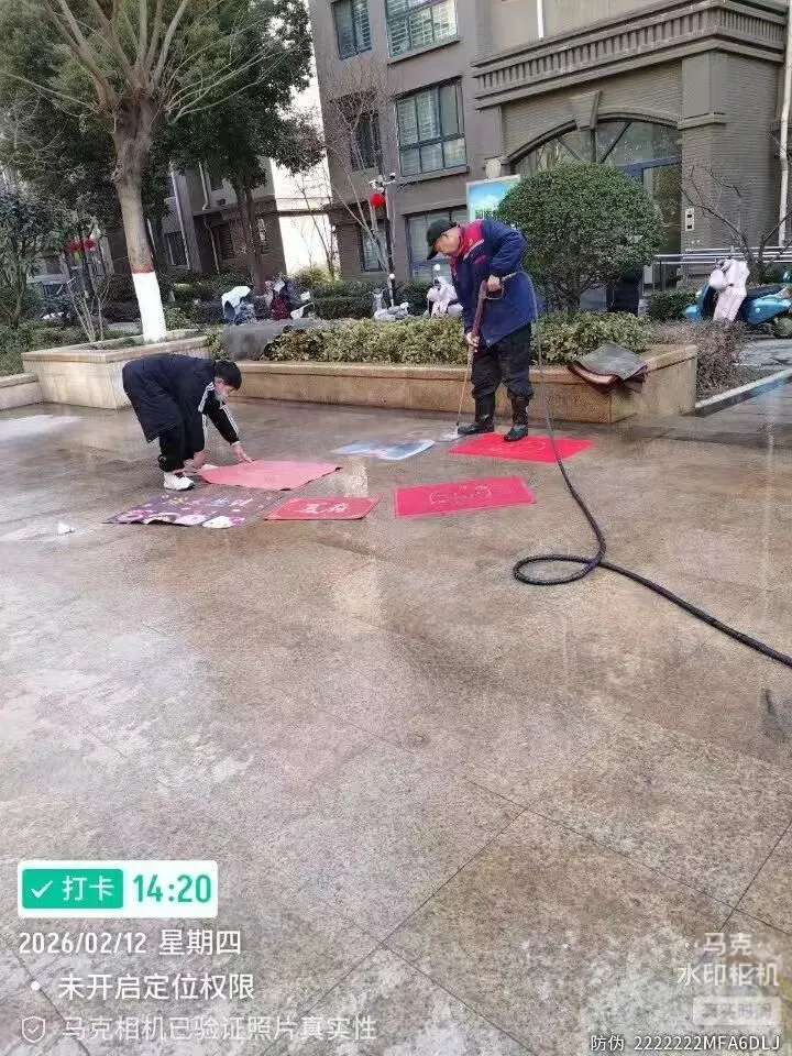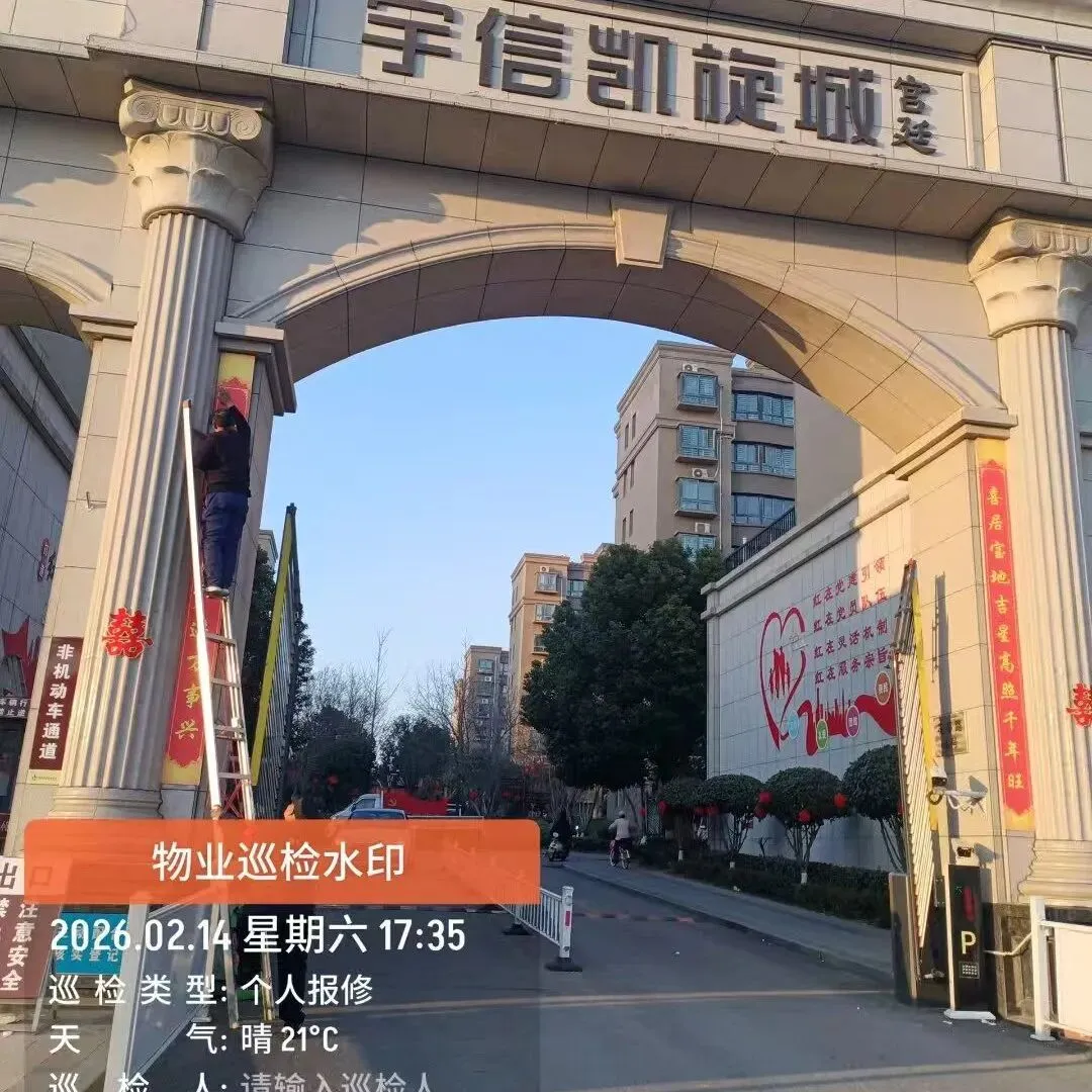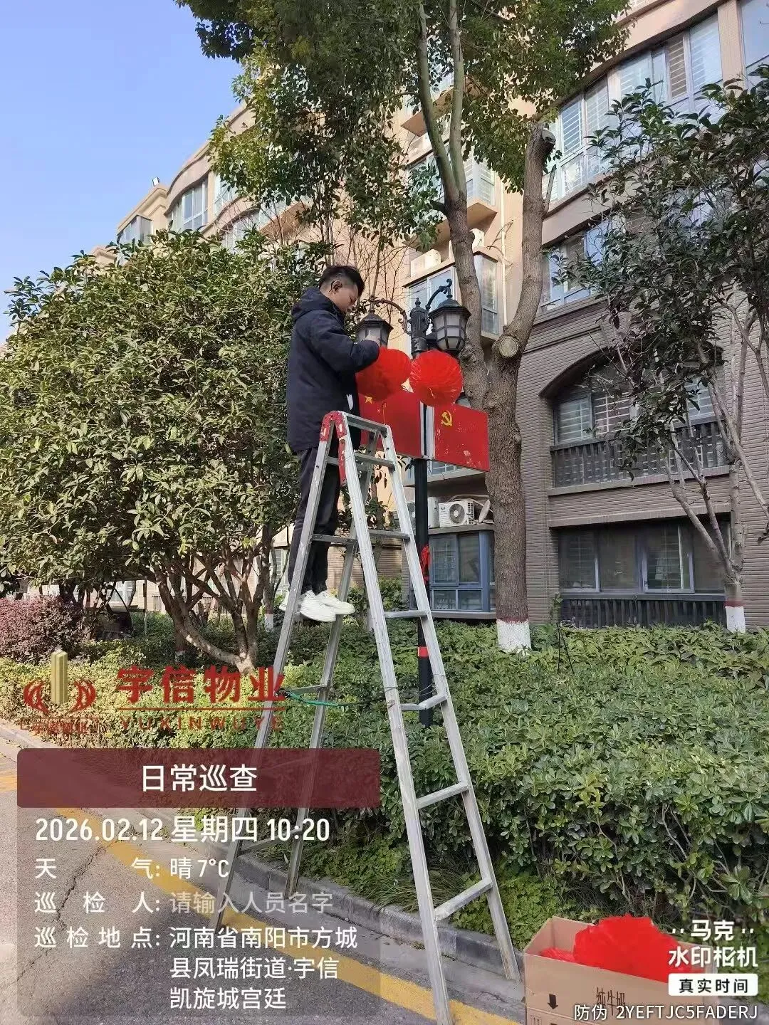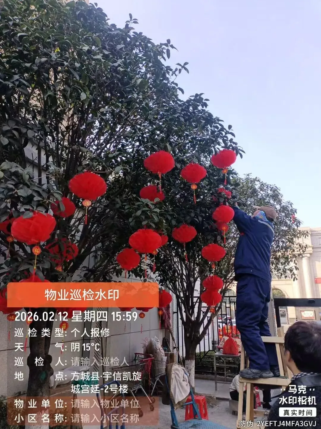 欢声笑语满园区,喜气洋洋,迎新年,灯笼高挂映笑脸,小区装扮换新颜,物业巧手扮家园,只为给您最温馨的幸福家园。
