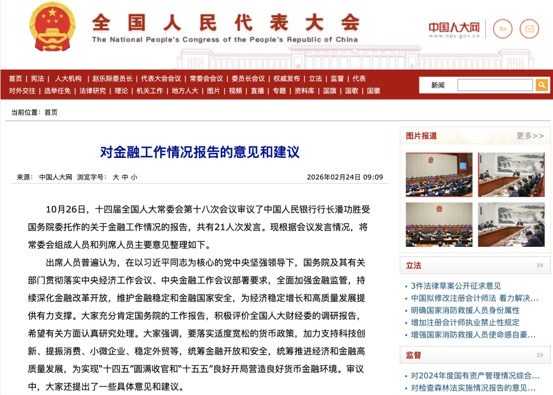 10月26日,十四届全国人大常委会第十八次会议审议了中国人民银行行长潘功胜受国务院委托作的关于金融工作情况的报告,共有21人次发言。现根据会议发言情况,将常委会组成人员和列席人员主要意见整理如下。