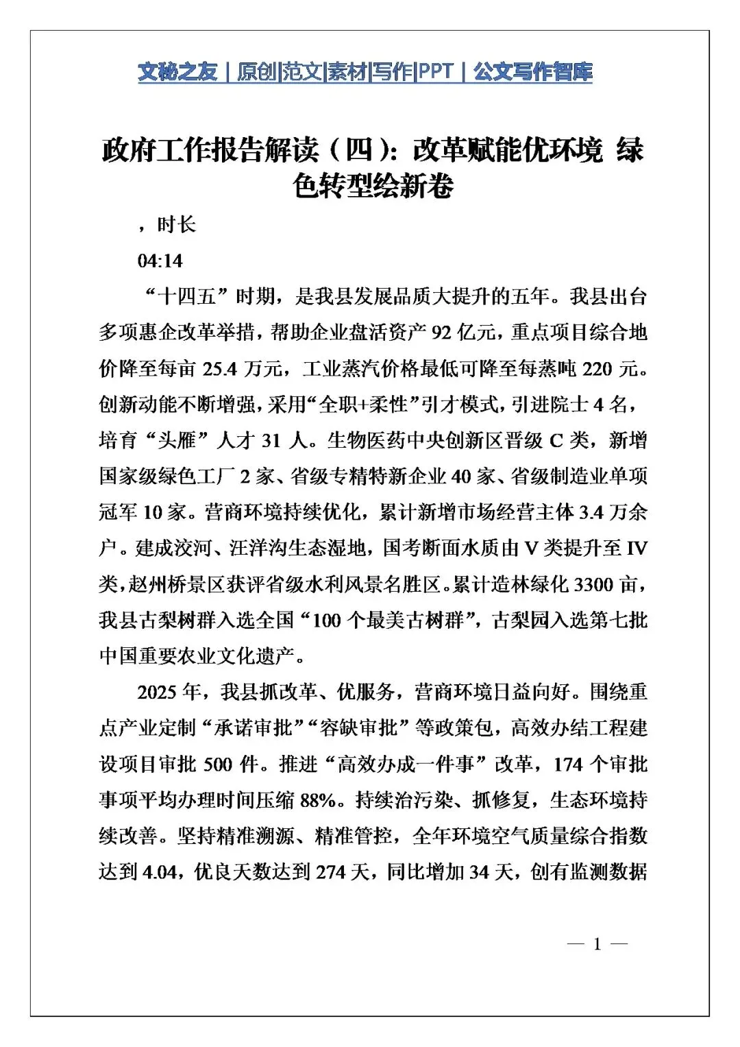 亲爱的文友,我今天推荐的文章是《政府工作报告解读(四):改革赋能优环境,绿色转型绘新篇》