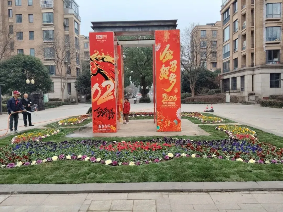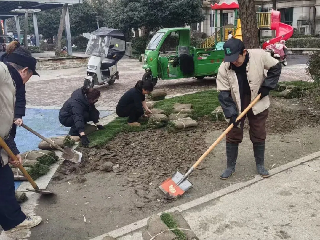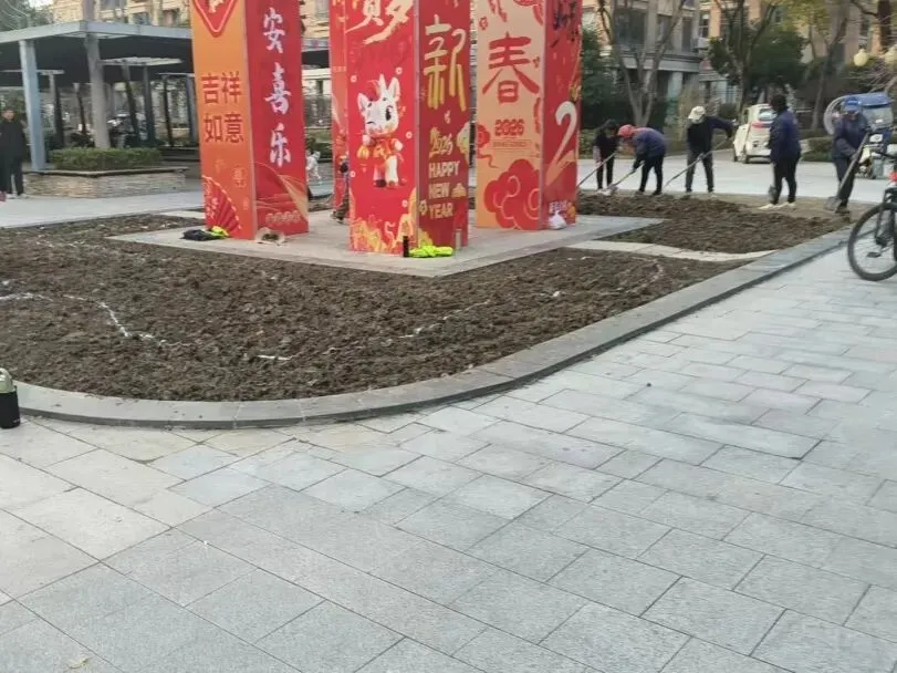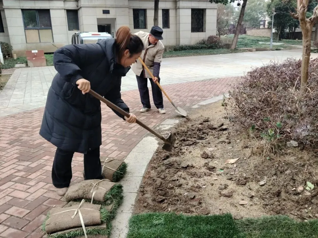 服务中心对欢乐广场荒芜的绿化区域进行翻土整理、铺设新草皮、种植花卉并搭配喜庆装饰,以此提升小区整体美观度与温馨感,打造更宜居的生活环境。