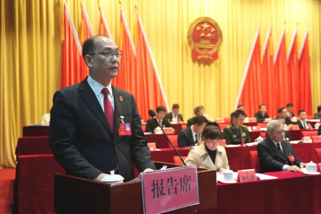 院党组书记、院长韦文雷代表忻城法院向大会报告工作