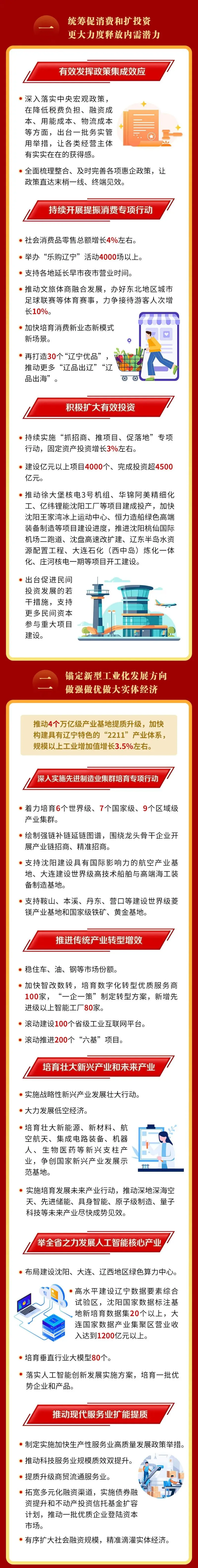 举全省之力发展人工智能核心产业。布局建设沈阳、大连、辽西地区绿色算力中心。高水平建设辽宁数据要素综合试验区,沈阳国家级数据标注基地新培育数据集20个以上,大连国家级数据产业集聚区营业收入达到1200亿元以上。培育垂直行业大模型80个。落实人工智能创新发展实施方案,培育一批优势企业和产品,促进人工智能赋能千行百业,推动智能经济和智能社会新形态蓬勃兴起。