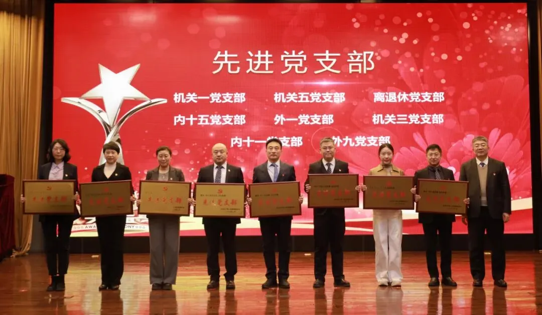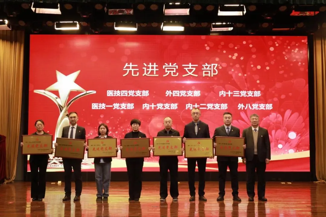 党委书记曲鹏为先进党支部授牌:机关一党支部、机关五党支部、离退休党支部、内十五党支部、外一党支部、机关三党支部、内十一党支部、外九党支部、医技四党支部、外四党支部、内十三党支部、医技一党支部、内十党支部、内十二党支部、外八党支部