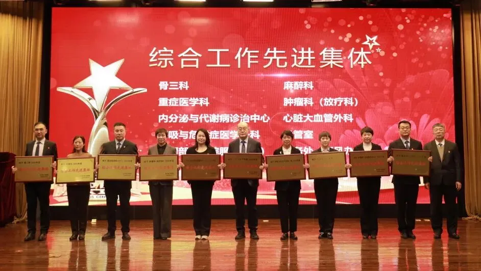 党委书记曲鹏为综合先进集体奖颁奖:骨三科(运动医学与关节外科)、麻醉科、重症医学科、肿瘤科(放疗科)、内分泌与代谢病诊治中心、心脏大血管外科、呼吸与危重症医学一科、导管室、护理部(住院服务中心)、医务处(行风办)