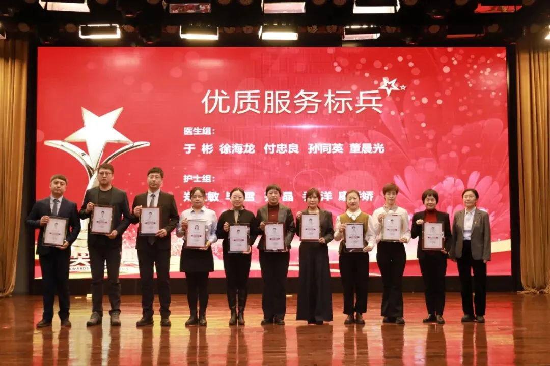 副院长周晓阳为优质服务标兵获得者颁奖(医生:于彬、徐海龙、付忠良、孙同英、董晨光)(护士:郑立敏、毕雪、齐晶、乔洋、康娇娇)(机关后勤部门:郭玮、刘恩娇、毕冉、孙丽丽、宋词)(窗口服务部门:岳莉、郭馥、任浩娜、林晓曦、向堃)