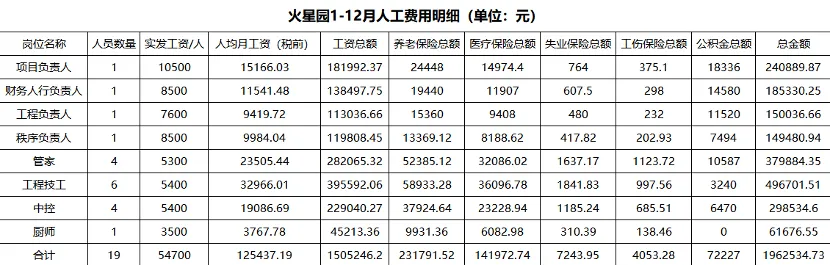 a、火星园物业费中人工费用占比为63.64%,包括自管人员费用、保安保洁费用。其中物业自管人员19人,包括1个项目经理,1个财务,1个工程主管,1个保安保洁负责人,4个管家,6个工程技工,4个中控室人员,1个食堂厨师,外包保安11人,交给外包公司费用5600元,个人实收4500元,7*12小时工作。保洁15人,交给外包费用3300元,个人实收2800元,实际收入包括加班费、值班费、夜班费所有总和。