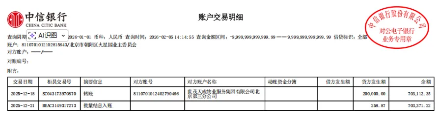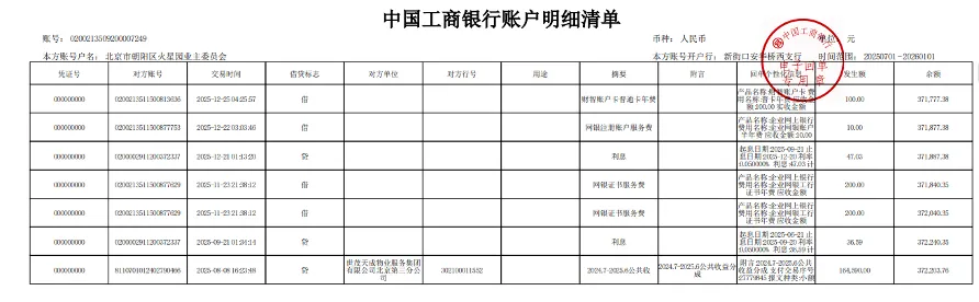 A、此账户于2023年11月24日开设,2025年发生手续费520元,产生利息177.71元。B、2025年4月7日,由公共收益账户支付三次业主大会条幅费用共387.01元。C、2025年8月8日,世茂物业支付2024.7-2025.6公共收益分成164590元。截止至2025年12月31日,公共收益账户余额为37.17万元。其中2025年下半年公共收益尚未汇至业主大会公共收益账户,待款项到账可达50余万元。 2025年的公共收益账户入账是火星园有史以来最多的一年(42.6万元,扣税,扣除物业公司分成,业主大会公共收益账户可得28万),因为2025年有电信公司入场费(一次性给付),有电梯广告预付2026年上半年费用。目前和分众签订的电梯广告合同到2026年底截止,由于大环境影响,广告费大幅降低,合同到期后如果费用太低,可能不再签订新的电梯广告合同。2026年公共收益不容乐观,如果广告收入大幅缩水,又无新增收益来源,公共收益恐将回落至15万元左右(因仅有半年电梯广告收入),电梯广告合同完成后,2027年公共收益将降低至10万元以下。(3)资金监管账户情况: