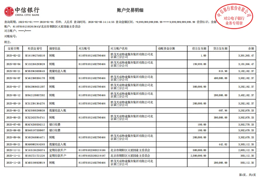 已委托北京东审会计师事务所(特殊普通合伙)对小区涉及的三个账户账目进行财务审计,内容详见审计报告。分别是以物业公司为主体的共管账户账目、以业主大会为主体的基本账户(存放公共收益)、以业主大会为主体的资金监管账户(监管物业费)。审计时间段为2025年1月1日至2025年12月31日。2、财务流程和设置: