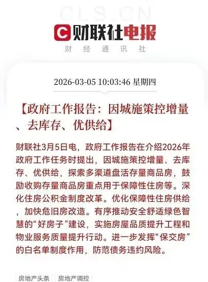 刚刚,2026 年政府工作报告正式发布,房地产板块释放清晰信号:因城施策控增量、去库存、优供给,探索多渠道盘活存量商品房。