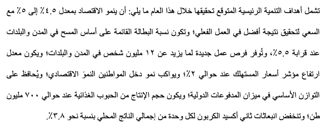 В намеченных на текущий год основных показателях развития предполагается, что экономический рост составит 4,5%–5%, при этом в практической работе мы будем стараться превзойти этот показатель; уровень безработицы, рассчитанный на основе выборочных исследований в городах и поселках, составит приблизительно 5,5%, прирост численности занятого населенияв городах и поселках превысит 12 млн человек; рост индекса потребительских цен ожидается на уровне около 2%; доходы населения будут расти соразмерно росту экономики; в целом сохранится сбалансированность международных платежей; объем производства зерна достигнет приблизительно 700 млн тонн; углеродоемкость ВВП снизится примерно на 3,8%.