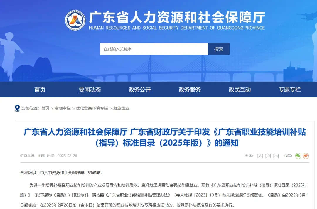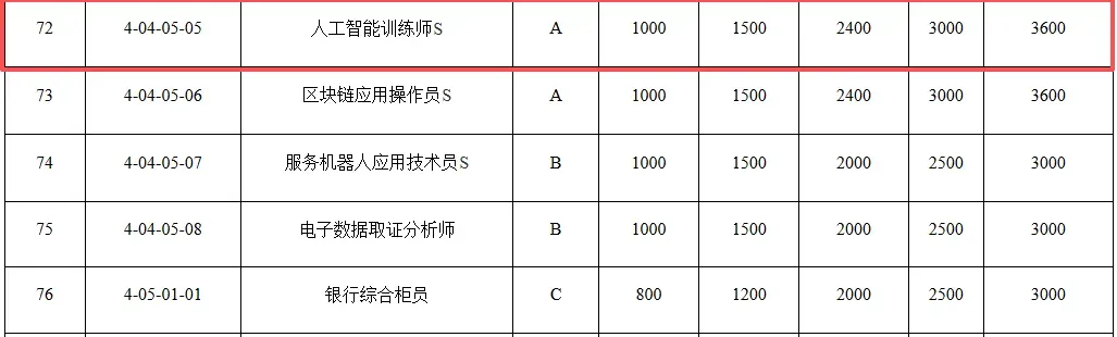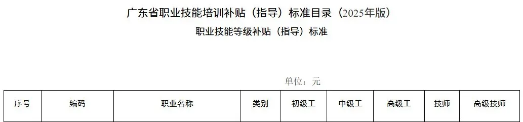 为进一步增强补贴性职业技能培训的产业发展导向和培训质效,更好地促进劳动者强技能稳就业,广东省人力资源和社会保障厅印发《广东省职业技能培训补贴(指导)标准目录(2025年版)》,人工智能训练师作为数字职业,补贴标准为五级(初级)1000元、四级(中级)1500元、三级(高级)2400元、二级(技师)3000元、一级(高级技师)3600元。