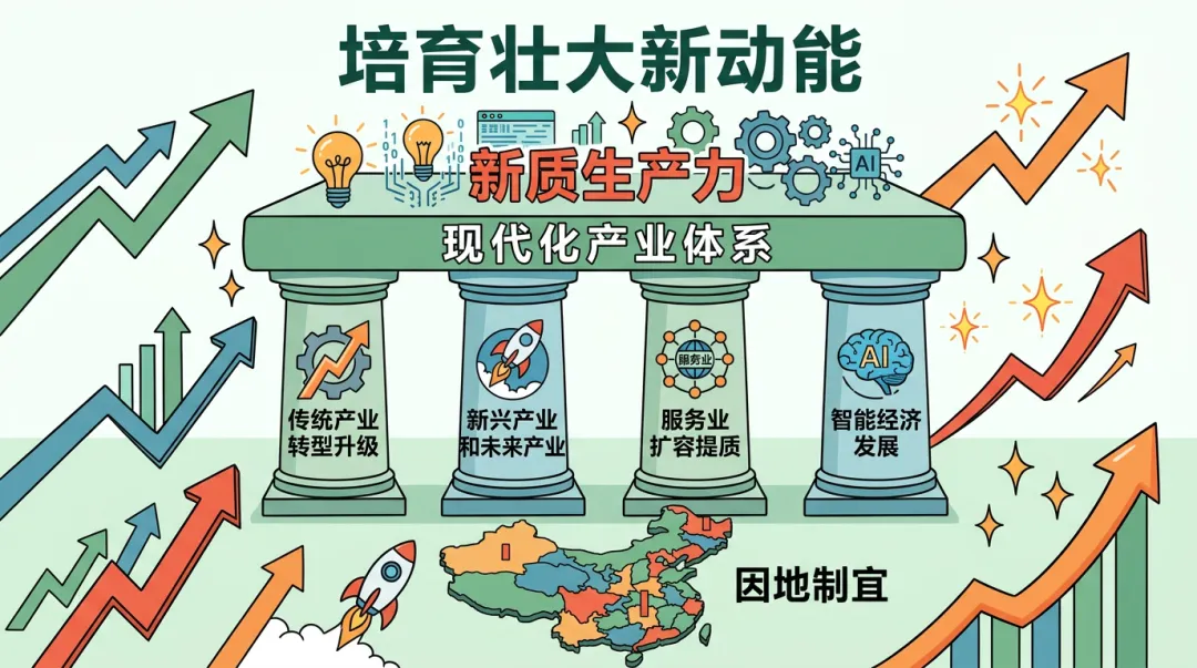 2026年政府工作报告明确将“加紧培育壮大新动能”作为年度重点任务,核心导向是坚持把发展经济的着力点放在实体经济上,因地制宜发展新质生产力,加快建设现代化产业体系。这一部署立足“十五五”开局关键节点,紧扣科技革命与产业变革趋势,构建起“传统产业焕新、新兴未来产业壮大、服务业提质、智能经济突破”的四维发力体系,为我国经济高质量发展注入强劲动力,彰显了推动产业转型升级、培育核心竞争力的坚定决心。