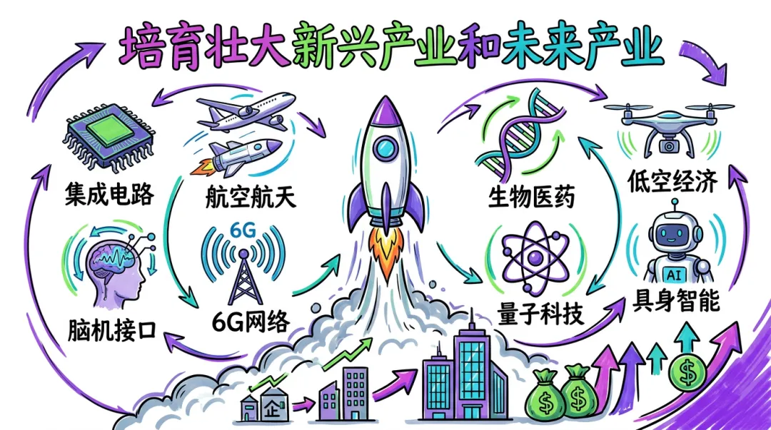 培育壮大新动能,核心在激活创新活力,重点在培育壮大新兴产业和未来产业。新兴产业是新动能的“增长极”,未来产业是抢占未来发展制高点的“先手棋”,报告明确了“重点突破、前瞻布局”的发展思路,构建起多层次、全方位的产业培育体系。在新兴产业培育上,实施产业创新工程,鼓励央企国企带头开放应用场景,聚焦集成电路、航空航天、生物医药、低空经济等领域,打造新兴支柱产业,推动这些领域从“跟跑”向“并跑”“领跑”跨越,形成具有国际竞争力的产业集群,这与工信部2026年重点工作部署高度契合。