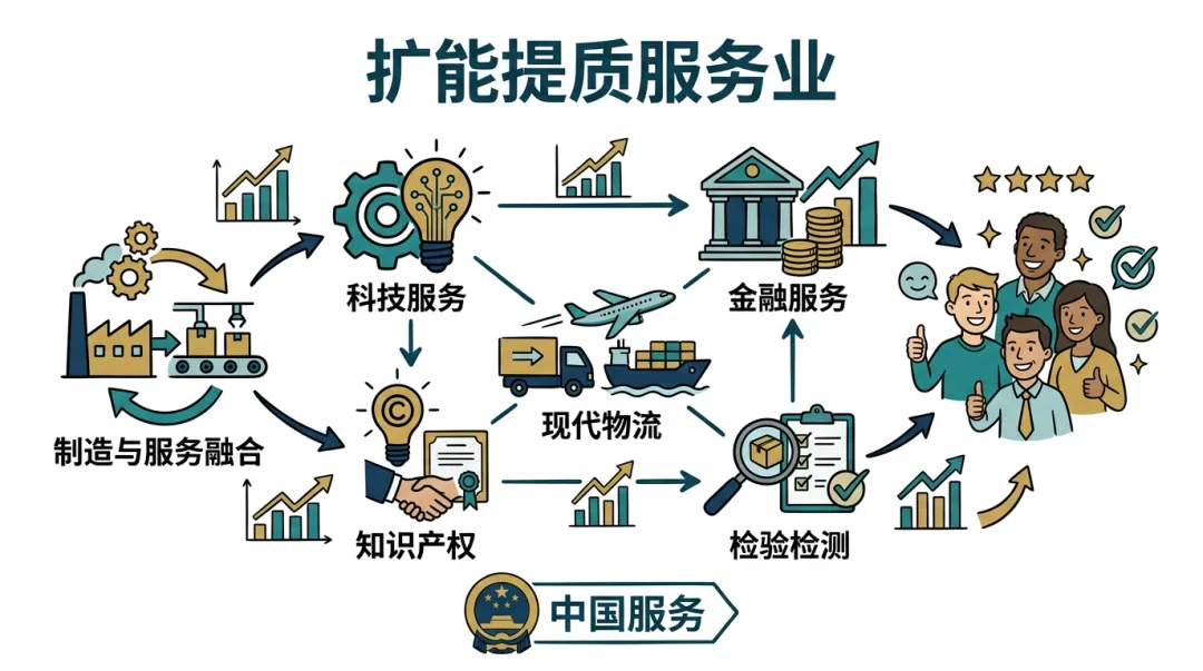 在生活性服务业方面,聚焦群众多样化需求,推动服务业高品质、多样化、便利化发展,不断提升群众消费体验,释放消费潜力。同时,有序放宽服务业准入限制,扩大重点领域服务业投资,健全服务业国家标准,培育“中国服务”品牌,推动我国服务业从“规模扩张”向“质量提升”转变,增强国际竞争力,让服务业成为培育新动能的重要支撑力量。