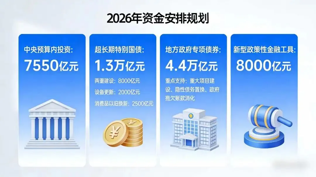 政府工作报告:2026年拟安排1.3万亿超长期特别国债+4.4万亿专项债+7550亿中央预算内资金+8000亿新型政策性金融工具