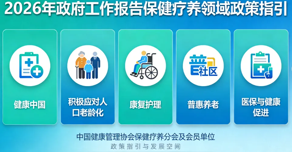 2026 年政府工作报告围绕健康中国、积极应对人口老龄化、康复护理、普惠养老、医保与健康促进等方向,直接/间接部署了多项与保健疗养康复领域高度相关的工作,为中国健康管理协会保健疗养分会及会员单位提供了清晰的政策指引与发展空间。