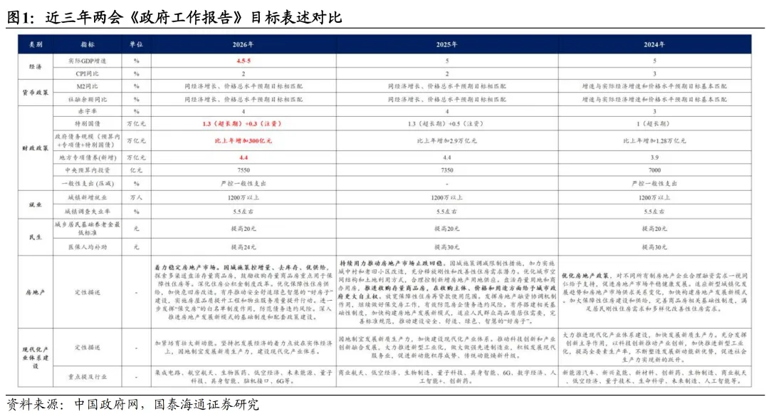 货币政策基调延续适度宽松,增量指引较为有限。此次全国两会政府工作报告对货币政策的提法,基本上和25年四季度货政报告以及26年央行工作会议等的表述保持一致,包括“适度宽松”的整体基调,以及“灵活高效运用降准降息等多种政策工具”的表述方式。对于货币政策,我们的观点一直是认为现阶段降准降息的目标并非是“宽信用、促信贷”,而是“稳息差、防风险”(请参照我们于2025年12月5日发布的《2026年货币政策展望:目标函数和宽松模式重构》)。鉴于财政已逐步开始积极发力,货币政策的角色会更重在配合与保障,降准降息的关注点在稳定银行息差和维护资本市场(此处可能更侧重股市)的平稳运行。