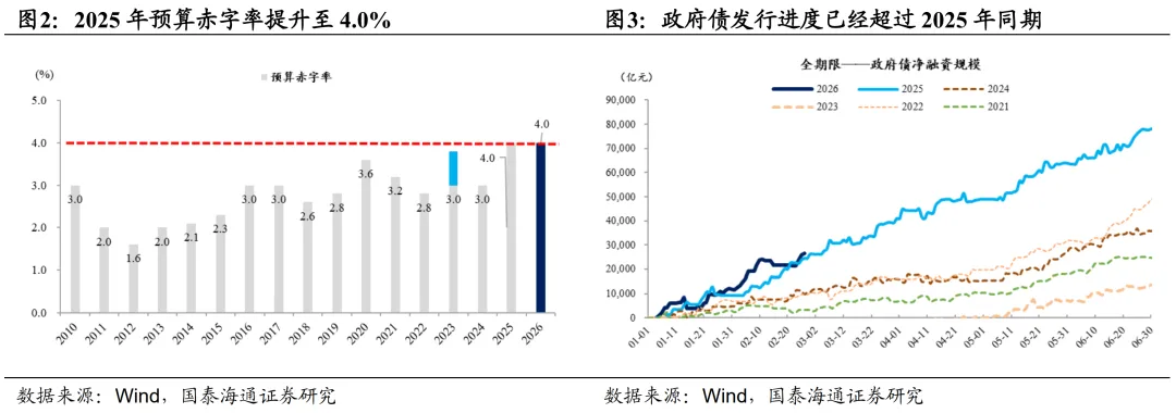 财政支出力度“只增不减”,赤字率持平。在经济增速目标4.5%-5%的指引下,根据全国两会政府工作报告,2026年赤字率拟按4%左右安排,对应赤字规模5.89万亿元(普通国债+地方一般债),超长期特别国债拟为1.3万亿(“两重两新”),支持国有大型商业银行补充资本的特别国债3,000亿,地方专项债新增规模4.4万亿,合计新增政府债务总规模11.89万亿。对比2024年,政府债务总规模多增300亿,其中以普通国债为主的预算内赤字多增2,300亿,超长期特别国债持平,支持国有大型商业银行补充资本的特别国债少增2,000亿,地方专项债持平。根据2026年财政预算报告,2026年全国一般公共预算支出增长4.4%,全国一般公共预算收入增长2。2%,差额由调入资金及结转结余2.05万亿和预算赤字5.89万亿来补足。