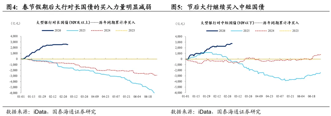 后续依然要持续关注超长政府债(尤其超长地方债)供需的平衡性。虽然新增政府债务的整体规模处在债市预期的下沿(特别是地方专项债),但从2026年初以来的发行情况来看,地方置换债和专项债发行期限依然偏长。后续随着超长期特别国债开启发行,债市对大行配置盘久期指标约束的担忧可能会再度浮现,同时春节假期后已经能够在二级现券买卖数据中观察到大行国债买入期限缩短的迹象。此外,此前债市预期的注资大型险企特别国债并未出现,对年内保险机构资金配债力量的预期也会形成一定扰动。