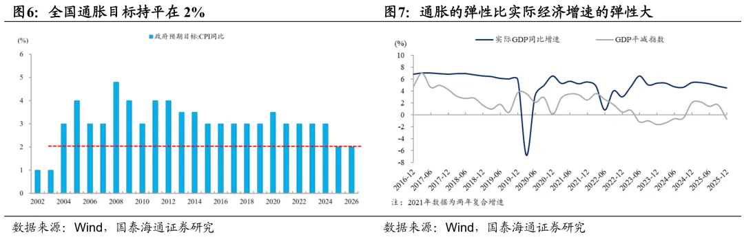 从财政政策的力度和新增政府债务规模来看,整体处于债市预期的下沿。此前财政部相关负责人在1月20日的国新办发布会上提出2026年财政赤字、债务总规模和支出总量将保持必要水平,确保总体支出力度“只增不减”。基于2035年远景目标中人均GDP翻一番的目标,“十五五”和“十六五”时期国内GDP需要年均增长4.17%,结合26年初经济大省的经济增速目标设置,两会前债市对全国增速目标设定在4.5%—5%已有较强共识。与稳健的经济增速目标对应,债市两会前瞻时债市对新增政府债务整体规模的预期也较为中性,实际兑现的财政政策力度基本符合预期。