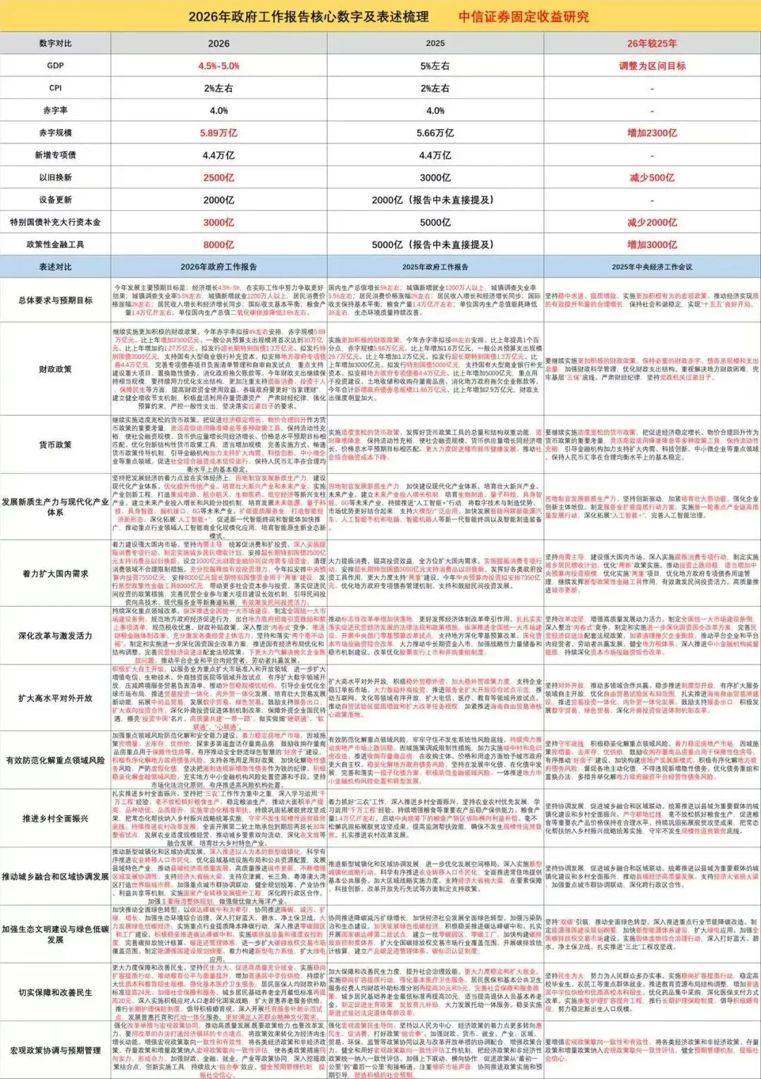 一、宏观经济目标:从实际出发,注重经济发展的质量。2023-2025年我国政府工作报告中经济增长目标均设为5%,最终均实现或超过了这一目标。2026年的经济增长目标设定在4.5%-5%,一方面是与我国2035年远景目标总体衔接:到2035年人均国内生产总值比2020年翻一番(即2026-2035年平均每年GDP增长4.17%左右),另一方面今年作为“十五五”开局之年,设立这一目标可以更好地为调结构、防风险、促改革留出空间,更为注重经济发展的质量。需要注意的是,政府工作报告中明确提到了“在实际工作中努力争取更好结果”,我们认为在各项经济增长动能的支持下实际的经济增长将明显超过4.5%。城镇调查失业率目标5.5%左右,体现了坚持就业优先政策导向和加大稳就业力度的要求。CPI目标在2%左右,考虑了预期引导和现实可能,今年将通过改善总供求关系推动价格总水平由负转正、消费价格合理温和回升。结合政府工作报告表述,我们认为这将通过多种方式来实现,例如综合运用产能调控、标准引领、价格执法、质量监管等手段,深入整治“内卷式”竞争,此外,今年的政府工作报告中还提及公用事业和公共服务价格改革、促进粮食等重要农产品价格保持在合理水平、优化医药集中采购和价格治理。