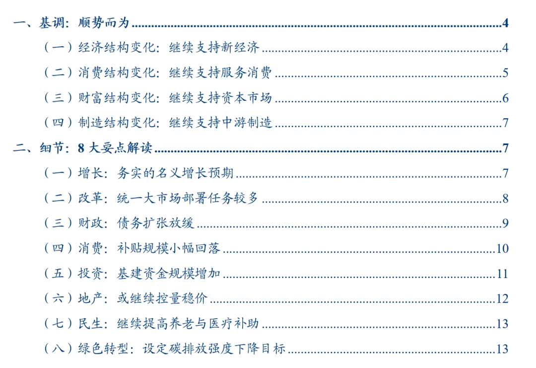 从政府工作对安排来看,加快高水平科技自立自强、纵深推进全国统一大市场建设等篇幅均较多。例如科技方面,“加强中试验证平台建设,完善新兴领域知识产权保护制度,加快重大科技成果高效转化应用”。反内卷方面“综合运用产能调控、标准引领、价格执法、质量监管等手段,深入整治 ‘内卷式’竞争,营造良好市场生态”。