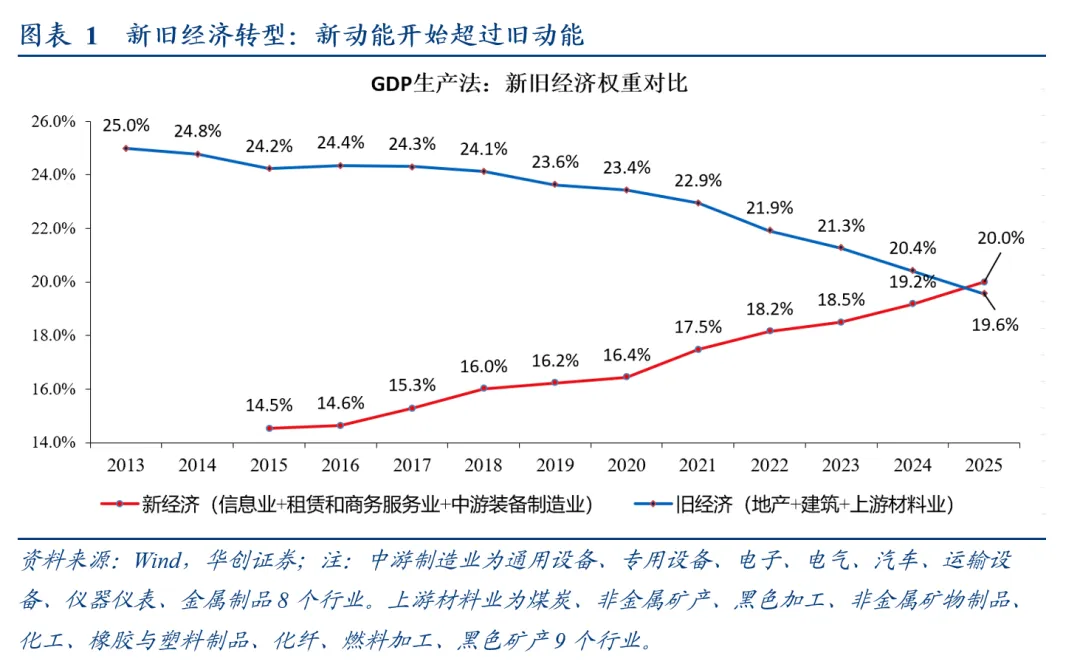 2026年是十五五规划的第一年,从目标的制定来看,或在衔接十五五规划。理解2026年的经济工作基调或需要从十五五的视角去观察。2021年到2025年经济结构转型剧烈,量变终于累积质变,GDP新旧经济占比、居民金融与地产资产占比、消费的服务和商品增速、上中下游表需增速都发生了关键的“交叉”,这意味着向后看的“旧势能”拖累越来越小,向前看的“新势能”将越来越具备总量经济的支撑作用。