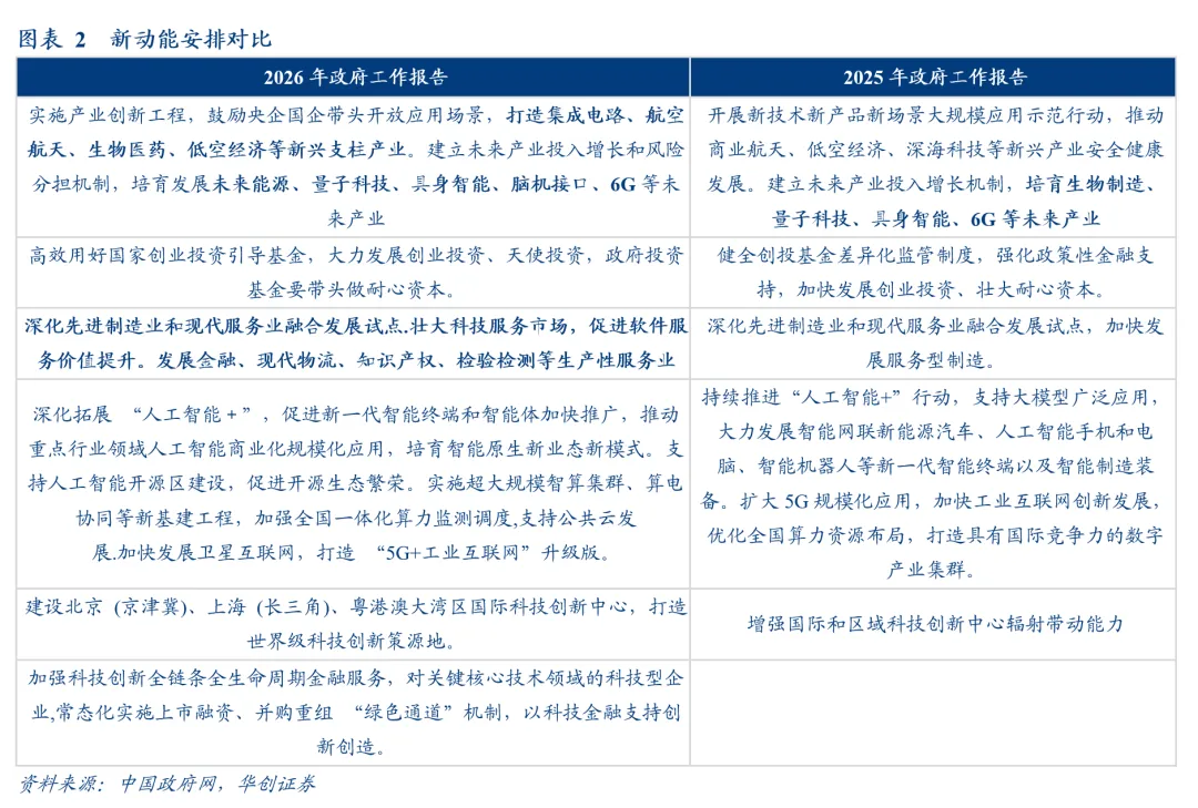 1)新动能的行业涉及上,制造业提及“集成电路、航空航天、生物医药、低空经济”、“未来能源、量子科技、具身智能、脑机接口、6G”等行业。与2025年相比,增加“集成电路”、“未来能源”、“脑机接口”。服务业方面,单列一段,强调多个生产性服务业的壮大,包括“科技服务市场、金融、现代物流、知识产权、检验检测”等。
