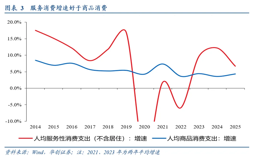 2025年,居民人均服务消费(不含居住)增速为6.7%,人均商品消费支出增速为4.4%。服务消费中,出行与文旅增速较快,人均交通和通信、教育文化和娱乐、其他用品及服务增速分别为8.3%、9.4%、11.2%。从国际发展阶段的比较而言,中国服务消费占比低于发达国家水平,服务消费(不含居住)增速更快符合消费的国际演变规律,对服务消费的侧重支持是“顺势而为”。