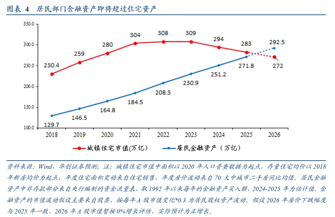 从过往几年的居民资产结构来看,住宅资产在回落,金融资产在回升。我们预计2026年金融资产将与住宅资产十分接近,甚至超过。这意味着,过去居民资产受地产拖累而收缩的客观趋势会慢慢在金融市场的发展下具备了“对冲”的力量,接受居民资产的结构转变,并进一步发展好金融市场就是“顺势而为”。
