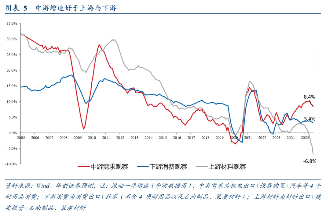 从制造业的需求观察来看,中游制造2025年增速为8.4%,好于上游的-6.8%以及下游的3.4%。就中游制造业的机遇而言,未来几年或迎来全球供给担忧下的投入增加带来的需求增长,是全球大势。不以人的意志为转移,政策也是顺势而为。中游制造的定价的提升,来自两方面,一方面是科技附加值,所以大力发展科技大概率都会落到中游制造上,一方面是供给格局优化,所以反内卷、统一大市场,都是顺势而为。关于中游制造的详细分析,参见《【华创宏观】进击的“中游”:来自供给力量的呐喊——战略看多中游制造系列一》。