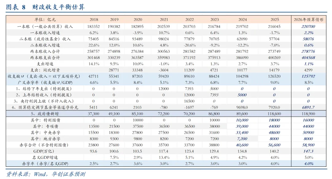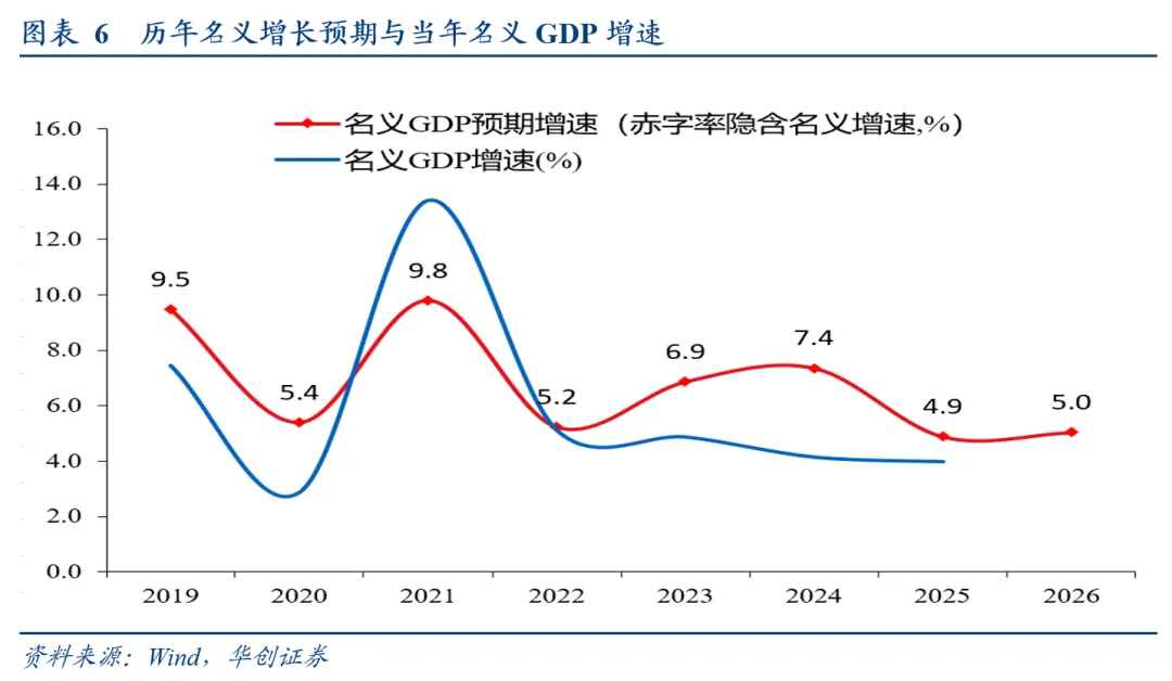 增长方面,实际增速目标为“4.5%—5%,在实际工作中努力争取更好结果”。根据赤字率“4%左右”、赤字规模“5.89万亿”倒算的名义增速预期是5.04%,略高于去年的预期(4.89%)。同时也与物价预期相匹配,“推动价格总水平由负转正”。考虑到去年名义增速为4.0%,这意味着,2026年或较大概率实现名义增速的回升。