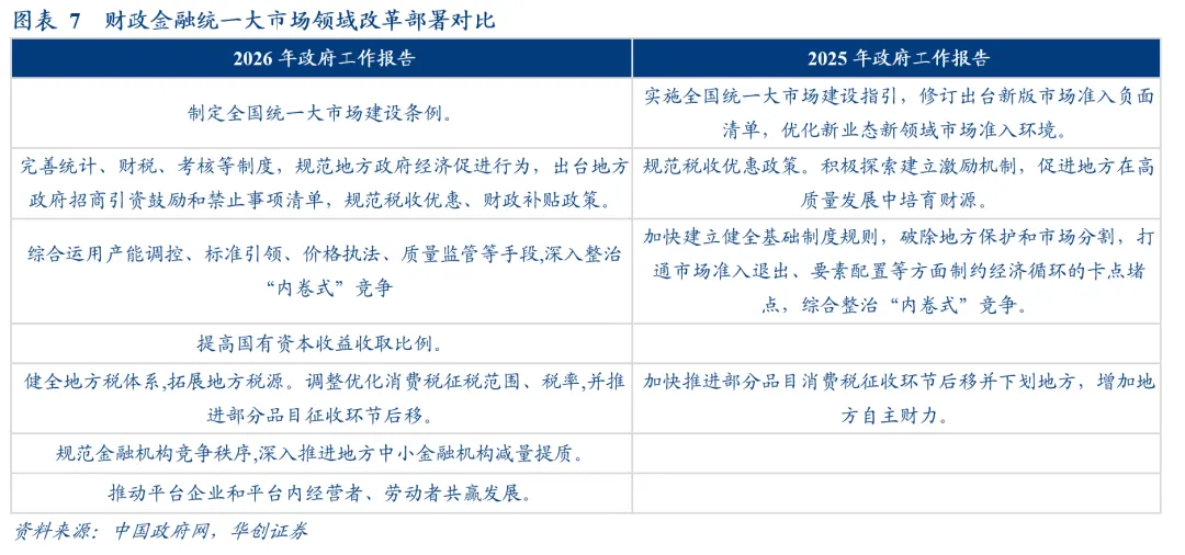 政府工作任务的第四个任务是“持续深化重点领域改革”。与去年相比变化是,首先:改革具体事项的排序上,统一大市场建设由去年的第二段上移至第一段,优先级上或有所靠前。其次,统一大市场的具体抓手上,提及较多,包括“制定全国统一大市场建设条例”、“完善统计、财税、考核等制度”、“出台地方政府招商引资鼓励和禁止事项清单”、“规范税收优惠、财政补贴政策”、“综合运用产能调控、标准引领、价格执法、质量监管等手段,深入整治‘内卷式’竞争”。