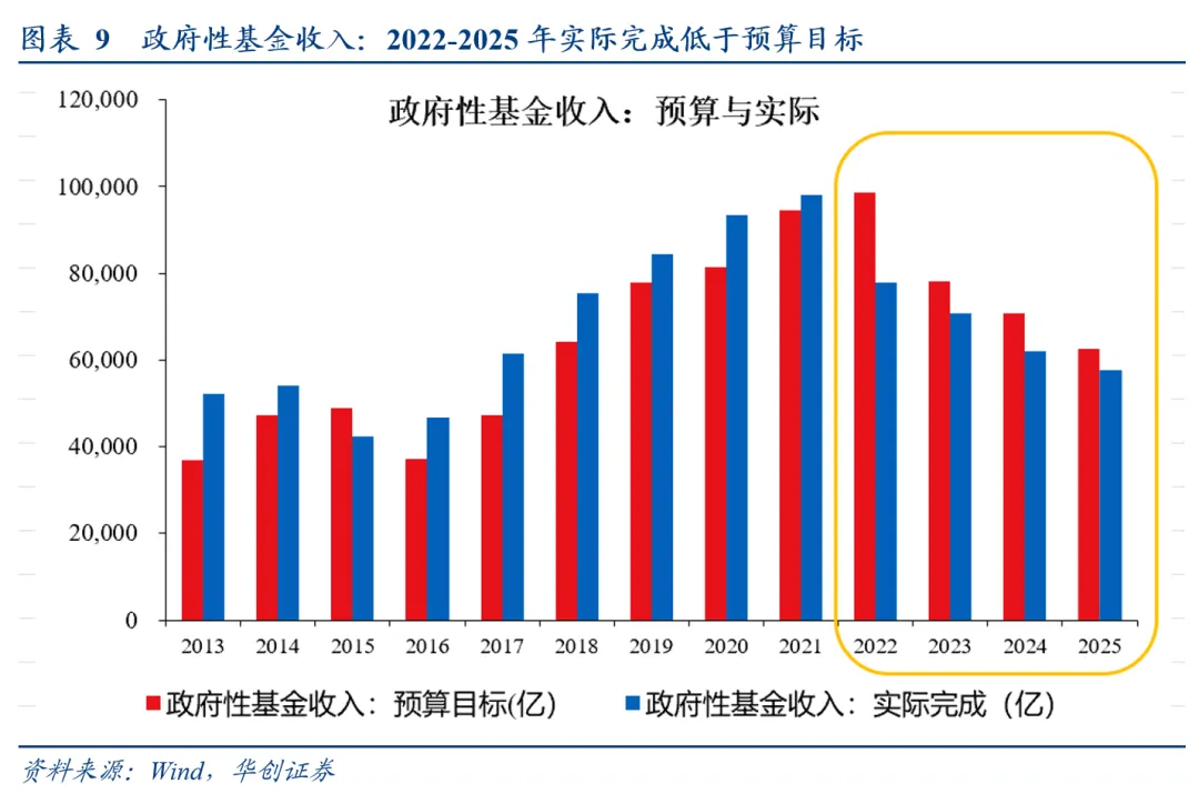 2)两本账财政支出:在债务融资的基础上,叠加一般公共预算收入、政府性基金收入、上年结转收入、全国国有资本经营预算调入、中央预算稳定调节基金调入,可得到2026年的两本账预算支出增速,为1.1%,低于2025年的3.7%的实际支出增速。此外,需要提示的是,政府性基金收入对土地出让较为依赖,2022-2025年,受土地出让收入下滑影响,实际完成收入低于当年预期收入。2026年,若土地市场较为疲软,或依然存在这一问题,进而拖累财政支出。