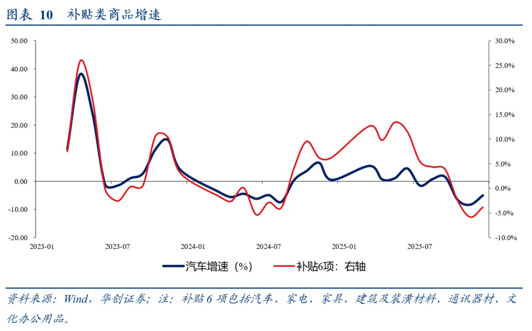 从补贴的乘数来看,2025年与2024年基本一致。若假设2026年补贴乘数不变,补贴相关耐用品增速或面临一定的回落压力。根据官方数据,“2025年以旧换新补贴,带动相关商品销售额超过2.6万亿元”、“2024年以旧换新合计带动相关产品的销售额超1.3万亿元”。即,2025年补贴带动商品消费额是2024年的一倍,与补贴金额一致(2024年安排1500亿元支持以旧换新)。