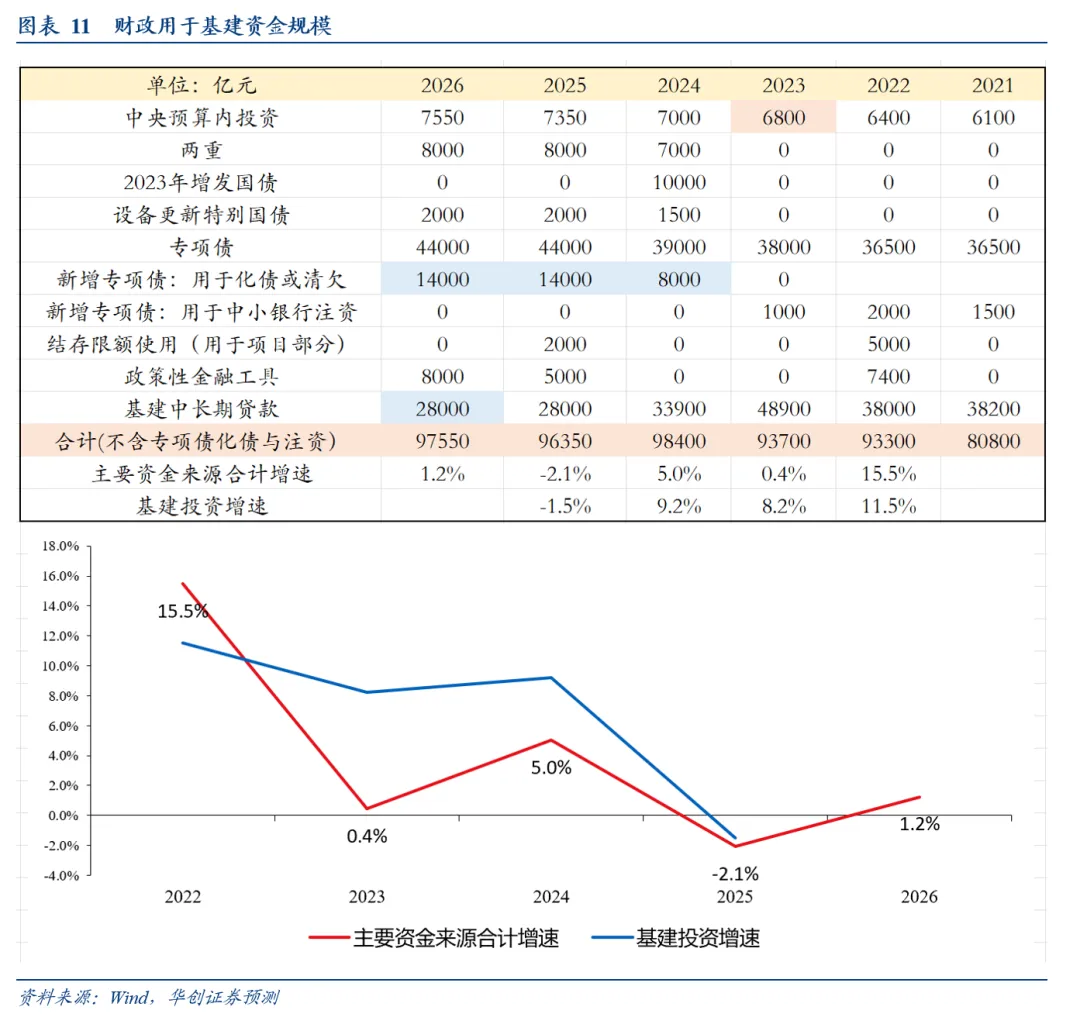 首先,新增专项债中或有部分用于化债或偿还企业清欠或用于中小银行注资,我们假设2026年新增专项债中用于这些的规模与2025年一致。这部分资金的使用与投资关系较小,予以剔除。其次,我们补充基建中长期贷款的数据,对于2026年,我们假设与2025年一致。再次,对于专项债的存量的使用,我们暂假设2026年没有这一安排。