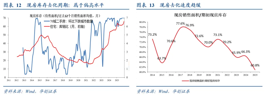 从现房的库存观察来看,目前依然处于库存去化慢、库存去化周期长的状态。以已竣工待售衡量现房,我们计算的去化月份到2025年12月底达到6.59个月,处于历史较高水平。以当年现房销售面积与期初现房库存的比值衡量去化速度,2025年全年为60.8%,处于历史较低水平。因而,有必要继续推动库存去化,以稳定房价。