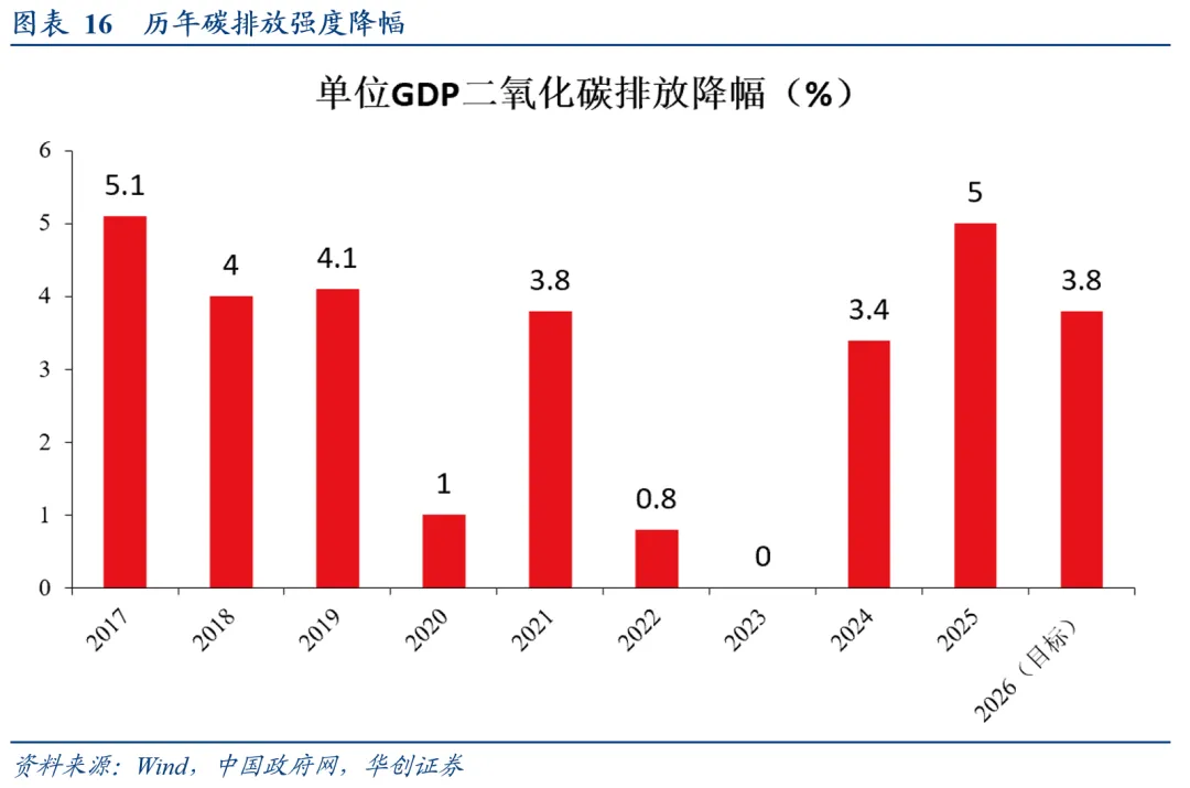 今年政府工作报告提及,“单位国内生产总值二氧化碳排放降低3.8%左右,综合考虑了经济社会发展、绿色低碳转型和国家能源安全等多种需要,有利于有序实现2030年前碳达峰目标。”2024-2025年,碳排放强度分别下降3.4%、5%。
