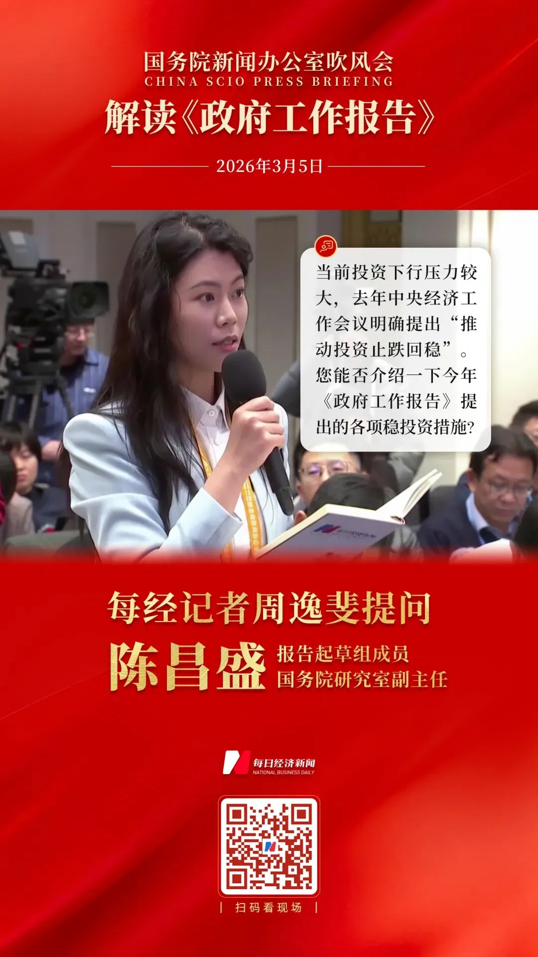 对于上述问题,陈昌盛回答《每日经济新闻》记者现场提问时表示,要充分发挥政府资金的引导和重大项目牵引作用。今年包括中央预算内投资、“两重”建设、地方政府专项债券、设备更新等方面,政府投资资金会超过5万亿元,如果再加上地方的配套资金,规模是很大的,带动作用是值得期待的。