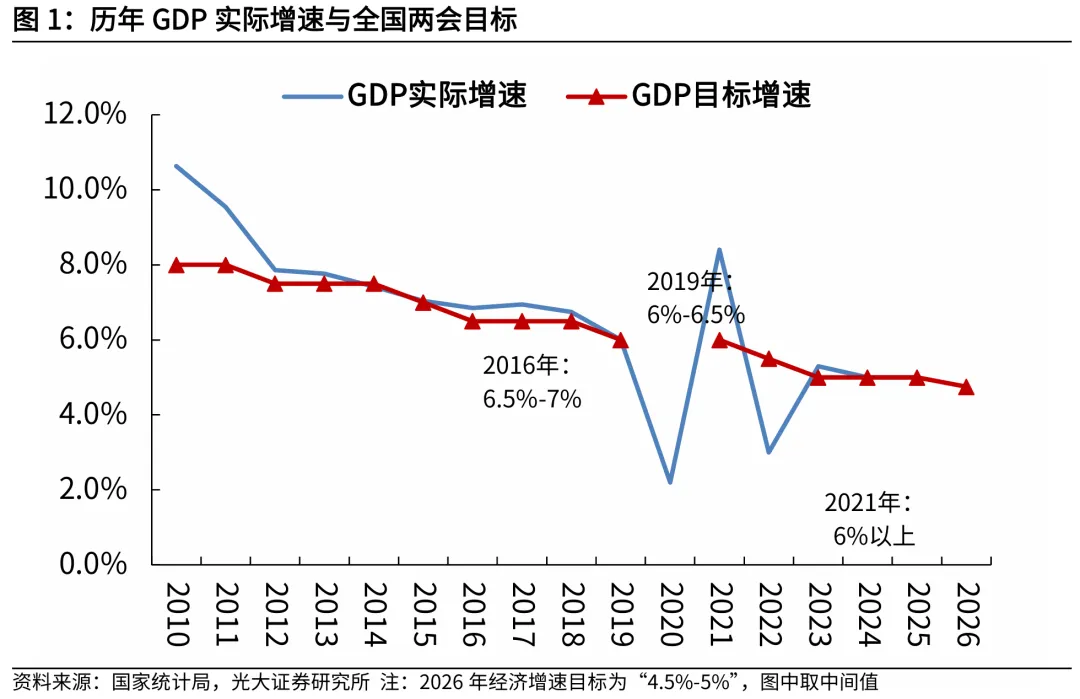 风险提示:国际地缘政治风险,国内经济恢复力度和政策力度不及预期。首先,2026年政府工作报告,对当前形势的判断是更加“复杂严峻”。对当前外部形势,报告指出面对的是“多年少有的外部冲击挑战和国内两难多难问题交织叠加的复杂严峻形势”;对内部形势的判断,从2025年的“经济回升向好基础还不稳固”进一步深化为“供强需弱矛盾突出”与“新旧动能转换任务艰巨”,意味着当前供给端的产能优势与需求端的疲软之间的矛盾更加突出,在房地产等传统产业持续调整和新质生产力培育的衔接期,经济面临的阵痛更为明显。