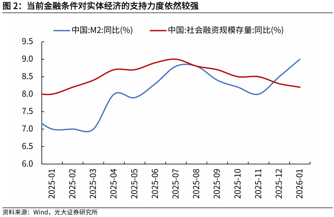 在货币政策的中介目标方面,“保持流动性充裕,使社会融资规模、货币供应量增长同经济增长、价格总水平预期目标相匹配”的表述一以贯之。2026年1月,M2同比增速为9%,社融存量同比增速为8.2%,均高于名义经济增长目标,表明金融条件对实体经济的支持力度较强。