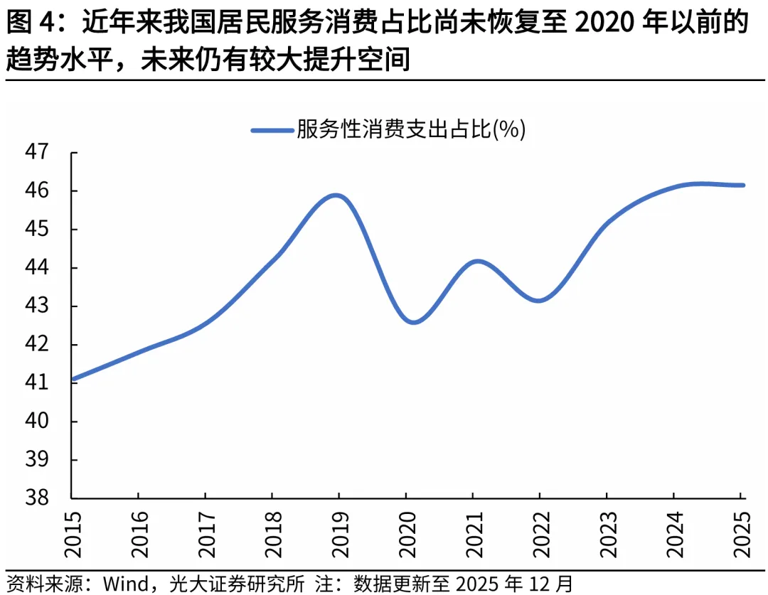 在资金方面,主要有两项新增政策安排。一是,安排超长期特别国债2500亿元支持消费品以旧换新,较上年3000亿元有所退坡。但实施范围拓宽至智能眼镜等数码产品,财政乘数可能因为纳新而稳定甚至提高;二是,新设立1000亿元财政金融协同促内需专项资金,组合运用贷款贴息、融资担保、风险补偿等方式,支持扩大内需。我们理解这部分资金安排除了用于支持居民消费信贷之外,或更多用于扩大服务消费供给侧,为服务业经营主体提供便利资金。