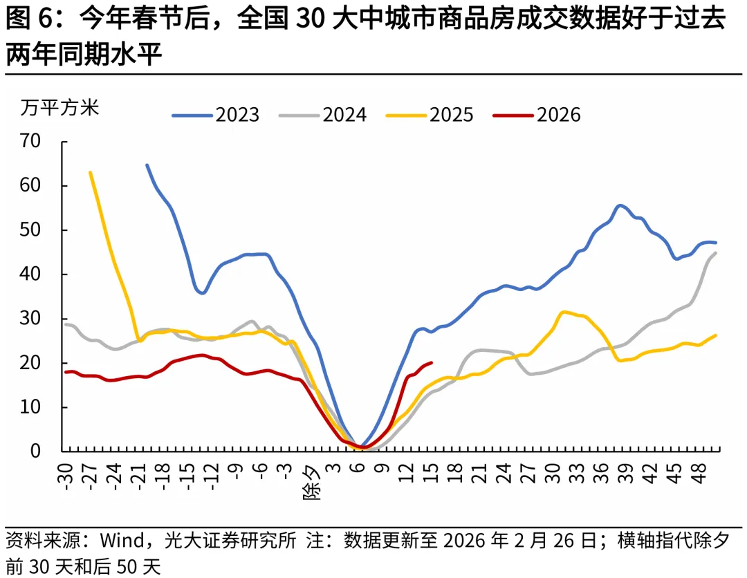 房地产方面,政策表态沿用2025年12月中央经济工作会议精神,继续强调“着力稳定房地产市场”,对房地产企稳诉求仍然较强。近期北京、上海楼市再度松绑,表明政府稳楼市意愿仍然较强。而从房地产基本面来看,在经历过去几年调整之后,库存压力已有所缓解,新房和二手房成交量趋稳,二手房成交价格跌幅收窄,房地产市场回稳的基础正在加强。今年春节后房地产市场热度有所升温,全国30大中城市商品房成交量数据好于去年同期水平,未来关注部分核心地段价格回稳的可能性。