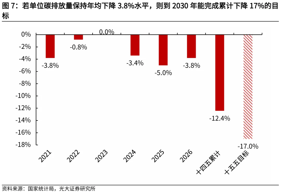 今年政府工作报告首次提出单位碳排放量指标,标志着能源双控全面转向碳排放双控。2024年8月,国务院发布《加快构建碳排放双控制度体系工作方案》,便提出建立能耗双控向碳排放双控全面转型新机制,强调“十五五”时期,在全国范围内实施以强度控制为主、总量控制为辅的碳排放双控制度。本次政府工作报告首次提出“2026年单位国内生产总值二氧化碳排放降低3.8%左右”,标志着向碳排放双控制度的正式转向,有助于更加精准高效实现碳减排目标。若单位碳排放量每年能保持下降3.8%的水平,2030年便能够完成碳达峰目标,即累计降低17%,整体强度高于“十四五”期间的累计下降12.4%。