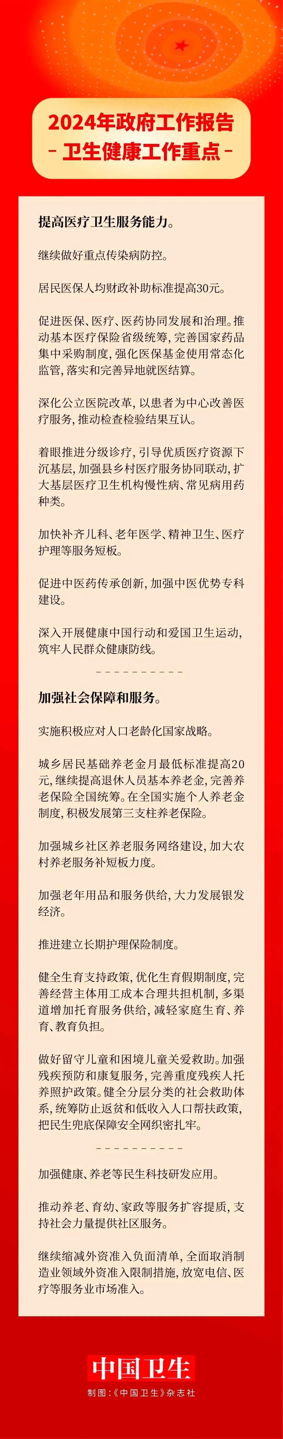 今年政府工作报告提到的卫生健康领域工作重点如下: