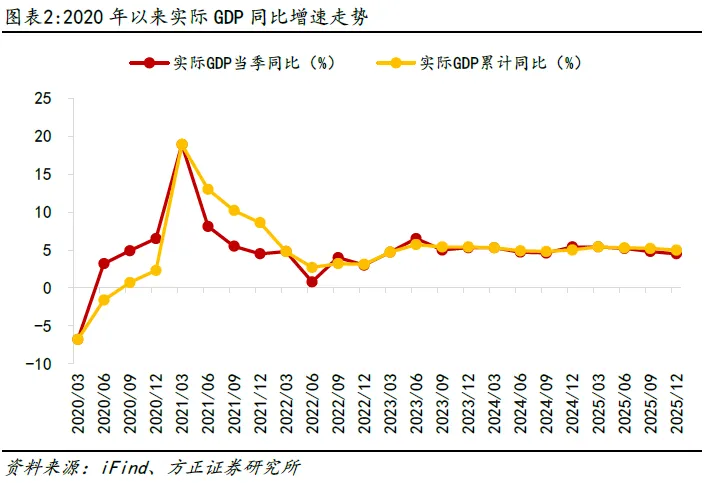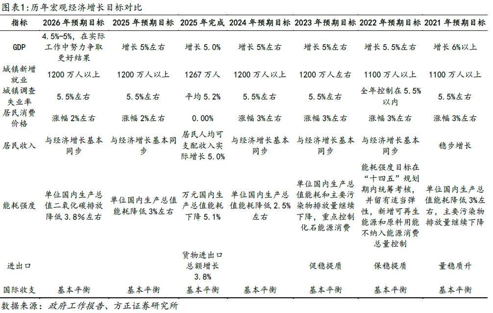 将经济增长目标设定在4.5%-5%区间范围内,一方面有助于稳定市场预期,增强市场信心。2025年是“十四五”规划收官之年,我国经济整体“稳、进、新、韧”,国内生产总值首次跃上140万亿元新台阶,顺利实现全年经济增长5%左右的目标;横向对比来看,2025年我国经济增速在主要经济体中名列前茅,对世界经济增长的贡献率预计达到30%左右,是世界经济增长最稳定、最可靠的动力源。“十四五”期间我国发展成就显著,但当前我国经济运行中困难挑战与向好趋势仍相互交织,外部环境看,2026年全球经济面临地缘政治冲突升级、贸易保护主义抬头等多重挑战,世界经济增长动能不足;内部因素看,国内供强需弱矛盾突出,重点领域风险隐患较多。政府工作报告将2026年经济增长目标设定在4.5%-5%区间,无疑给市场传递出了稳增长的积极信号,有助于稳定预期、提振信心。