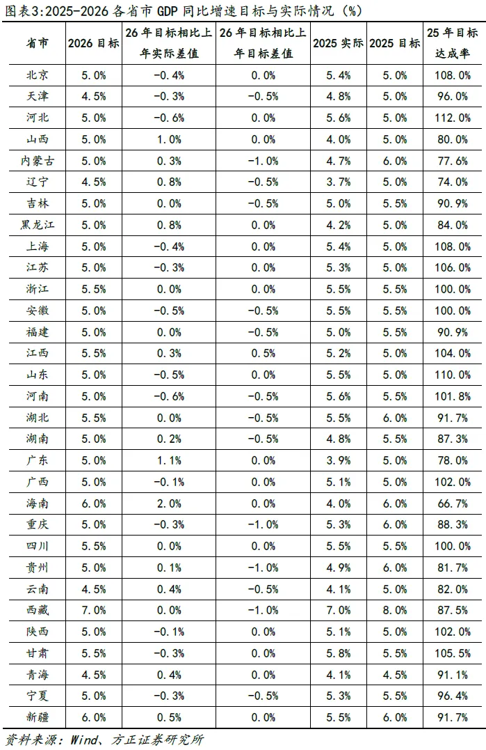 此外,从地方政府设定的经济增长目标来看,2026年全国经济增速设定为4.5%-5%区间也较为合理。从地方两会公布的数据来看,2026年31个省市自治区经济增长目标相对谨慎,相较2025年设定的经济目标,下调、持平、上调的省市自治区数量分别占45%、52%、3%;相较2025年实际增长情况,比重则分别为42%、19%、39%。2026年全部地方政府GDP目标加权平均值为5.1%,略低于2025年的加权均值5.3%,同时考虑到2025年地方政府经济增长目标的达成情况,2026年全国经济增长目标设定在4.5%至5%区间,略低于地方政府目标加权平均值的水平,目标设定也较为合理。
