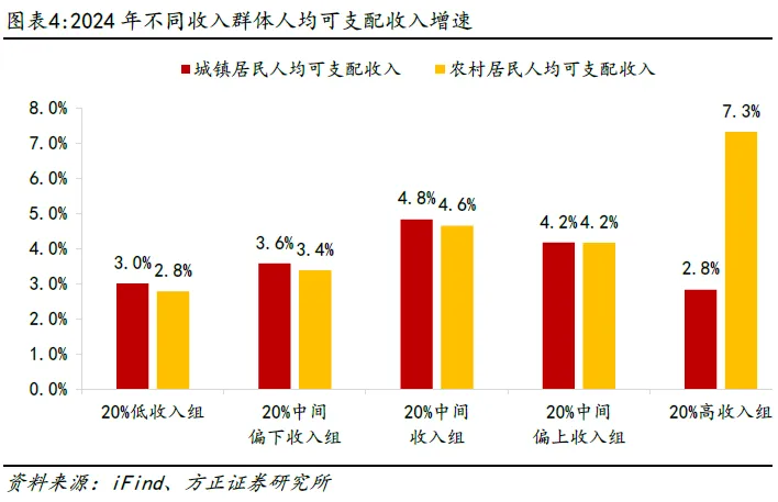 一是制定实施城乡居民增收计划,在促进低收入群体增收、增加居民财产性收入、完善薪酬和社保制度等方面推出一批务实举措。新冠疫情后特别是近两年来,我国低收入群体人均可支配收入增速要慢于其他收入群体。2024年,按照收入划分,城镇20%低收入组人均可支配收入增速仅略高于20%高收入组,农村20%低收入组人均可支配收入增速则远低于其他收入群体增速,在边际消费倾向递减的情况下,中低收入群体往往有更高的消费倾向,提高中低收入群体的消费能力和意愿能够有效带动消费需求提升。