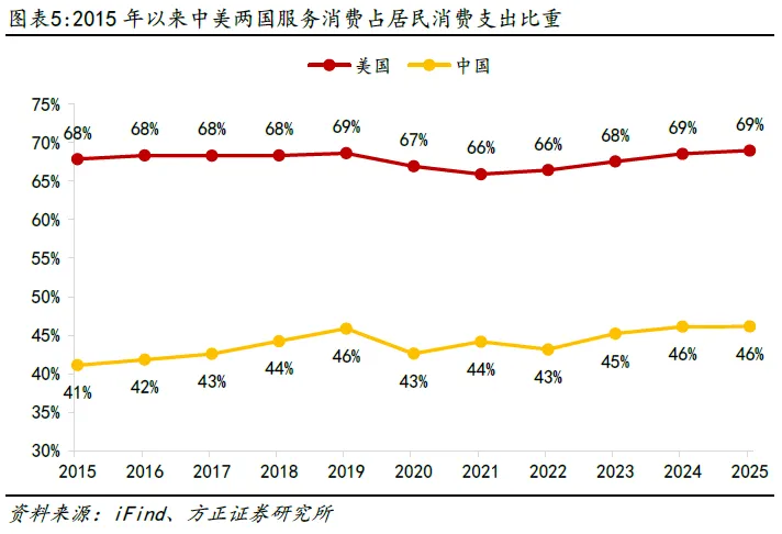 三是实施服务消费提质惠民行动,打造一批带动面广、显示度高的消费新场景,加快培育消费新增长点。与其他发达国家相比,我国目前服务消费占居民消费的比重仍然偏低,美国个人消费支出中服务消费占比一直稳定在三分之二,2025年占比为69%,而我国服务消费占比近十年虽然有所增加,但一直维持在40%以上不足50%,2025年服务消费占比为46%。我国服务消费具有非常大的发展空间和潜力,持续释放服务消费潜力将有助于更好地提振消费。