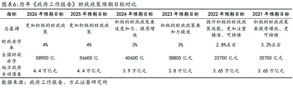 赤字率方面,2026年的赤字率拟按4%左右安排,2026年预算赤字规模5.89万亿元、比上年增加2300亿元。一般公共预算支出规模将首次达到30万亿元、比上年增加约1.27万亿元。拟安排地方政府专项债券4.4万亿元,完善专项债券项目负面清单管理和自审自发试点,重点支持建设重大项目、置换隐性债务、消化政府拖欠账款等。同时,2026年拟发行超长期特别国债1.3万亿元,持续支持“两重”建设、“两新”工作等;拟发行特别国债3000亿元,支持国有大型商业银行补充资本。